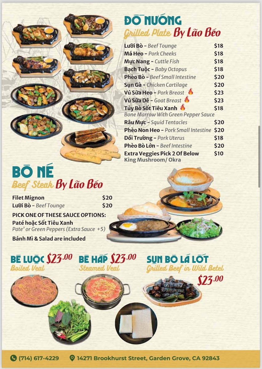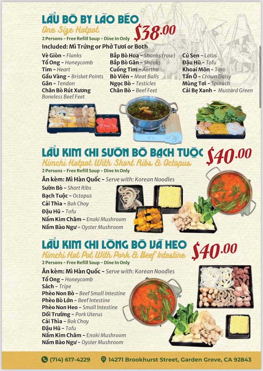 Welcome to Lau Bo by Lao Beo, a culinary jewel nestled in Garden Grove. This Vietnamese gem offers a delightful menu centered around the beloved dishes of pho and hot pot. Renowned for its rich, savory broth, each bowl of pho promises a deep flavor profile that captivates the senses. Customers rave about the tender beef that melts in the mouth, providing a satisfying experience with every sip.